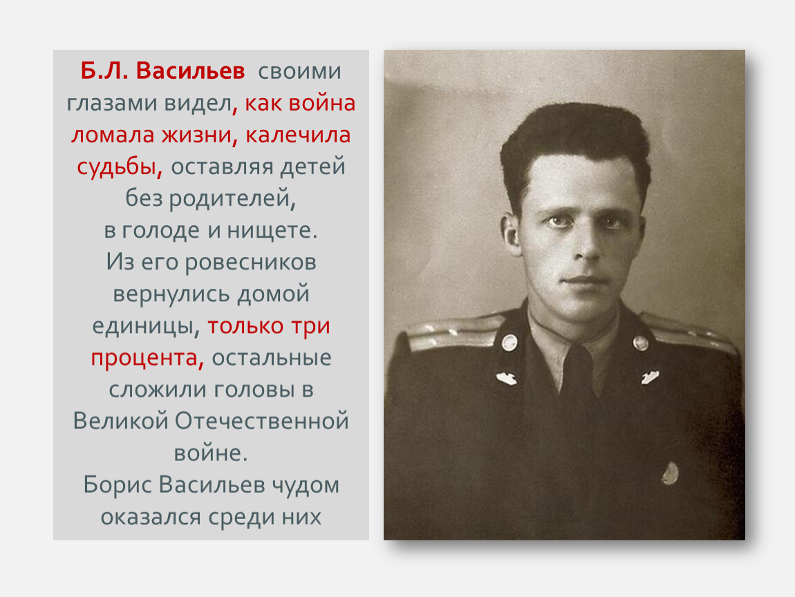 Б.Л. Васильев своими глазами видел, как война ломала жизни, калечила судьбы, оставляя детей без родителей,