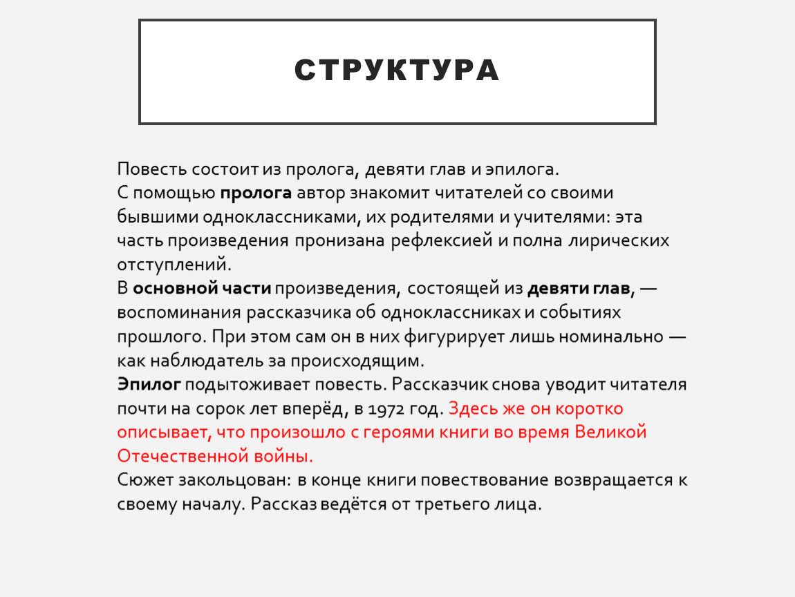 В основной части произведения, состоящей из девяти глав, — воспоминания рассказчика об одноклассниках и событиях прошлого. При этом сам он в них фигурирует лишь номинально — как наблюдатель за происходящим.