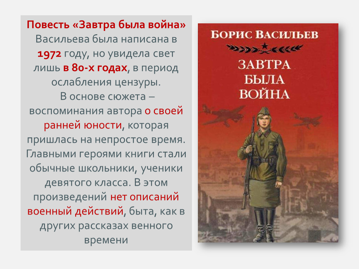 Повесть «Завтра была война» Васильева была написана в 1972 году, но увидела свет лишь в 80-х годах, в период