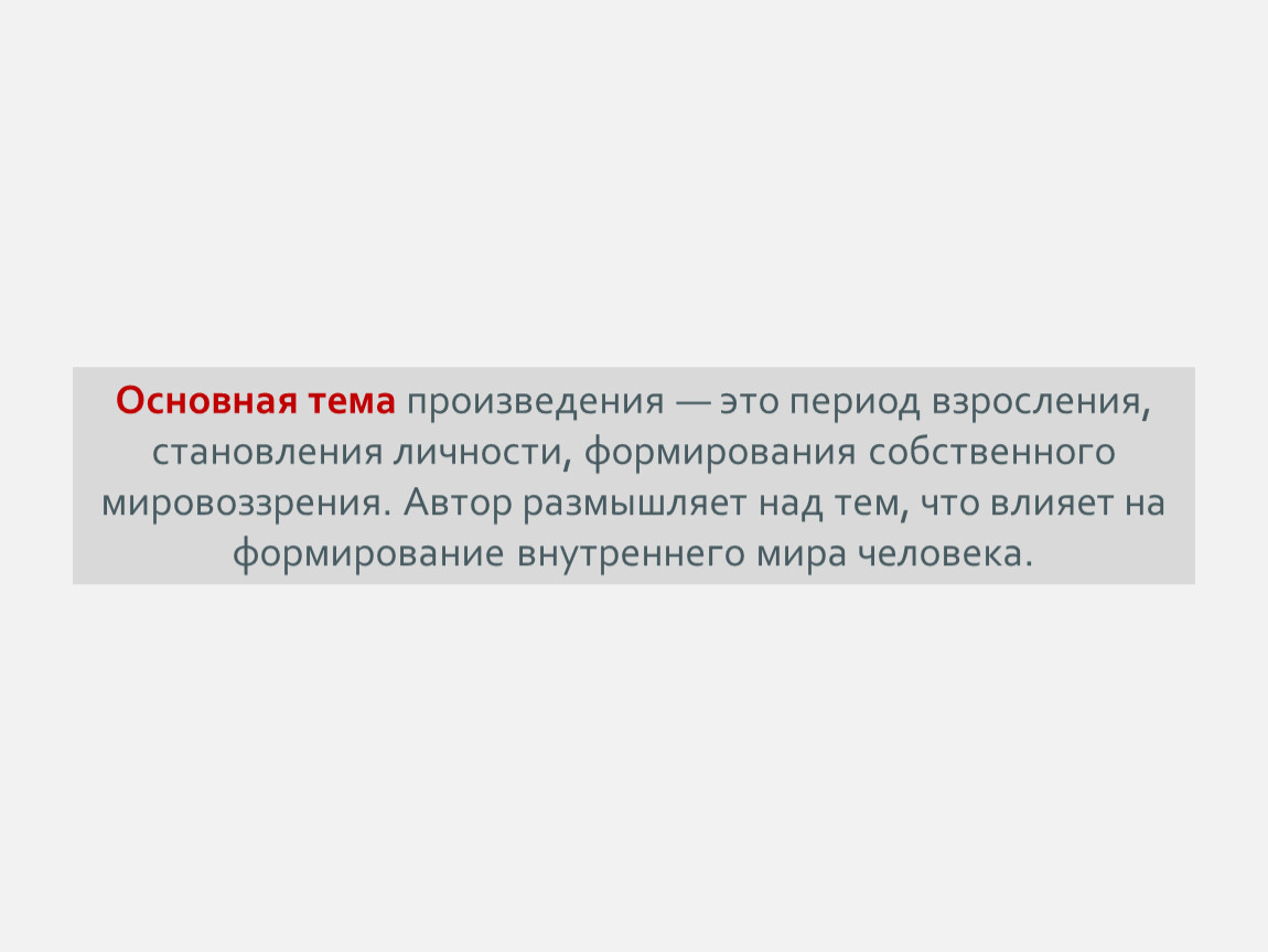 Основная тема произведения — это период взросления, становления личности, формирования собственного мировоззрения. Автор размышляет над тем, что влияет на формирование внутреннего мира человека.