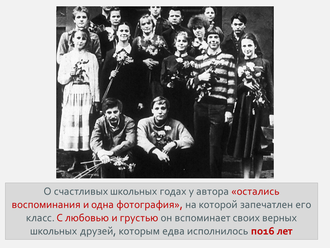 О счастливых школьных годах у автора «остались воспоминания и одна фотография», на которой запечатлен его класс. С любовью и грустью он вспоминает своих верных школьных друзей, которым едва исполнилось по16 лет