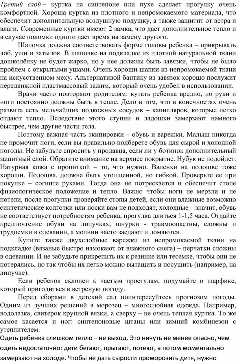 Поэтому важная часть экипировки – обувь и варежки. Малыш никогда не промочит ноги, если вы правильно подберете обувь для сырой и холодной погоды. Не забудьте спросить у продавца, если ли у ботинок дополнительный защитный слой. Обратите внимание на верхнее покрытие. Нубук не подойдет. Натурная кожа с пропиткой – то, что нужно. Валенки на подошве тоже хороши. Подошва, должна быть утолщенной, но гибкой. Проверьте ее при покупке – согните руками. Тогда она не потрескается и обеспечит стопе физиологическое положение и тепло. Важно чтобы ноги не мерзли и не потели, после прогулки проверяйте стопы детей, если они влажные возможно синтетические колготки или носки вам не подходят, холодные – значит, обувь не соответствует потребностям ребенка, прогулка длиться 1-1,5 часа. Отдайте предпочтение обуви на липучках, шнурки - травмоопастны, сложны и трудоемки в одевании, а молнии часто заедают и ломаются.