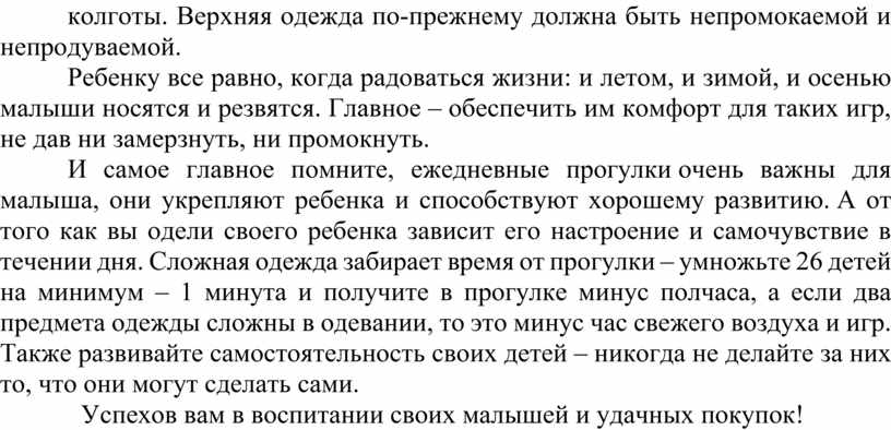 И самое главное помните, ежедневные прогулки очень важны для малыша, они укрепляют ребенка и способствуют хорошему развитию. А от того как вы одели своего ребенка зависит его настроение и самочувствие в течении дня. Сложная одежда забирает время от прогулки – умножьте 26 детей на минимум – 1 минута и получите в прогулке минус полчаса, а если два предмета одежды сложны в одевании, то это минус час свежего воздуха и игр. Также развивайте самостоятельность своих детей – никогда не делайте за них то, что они могут сделать сами.