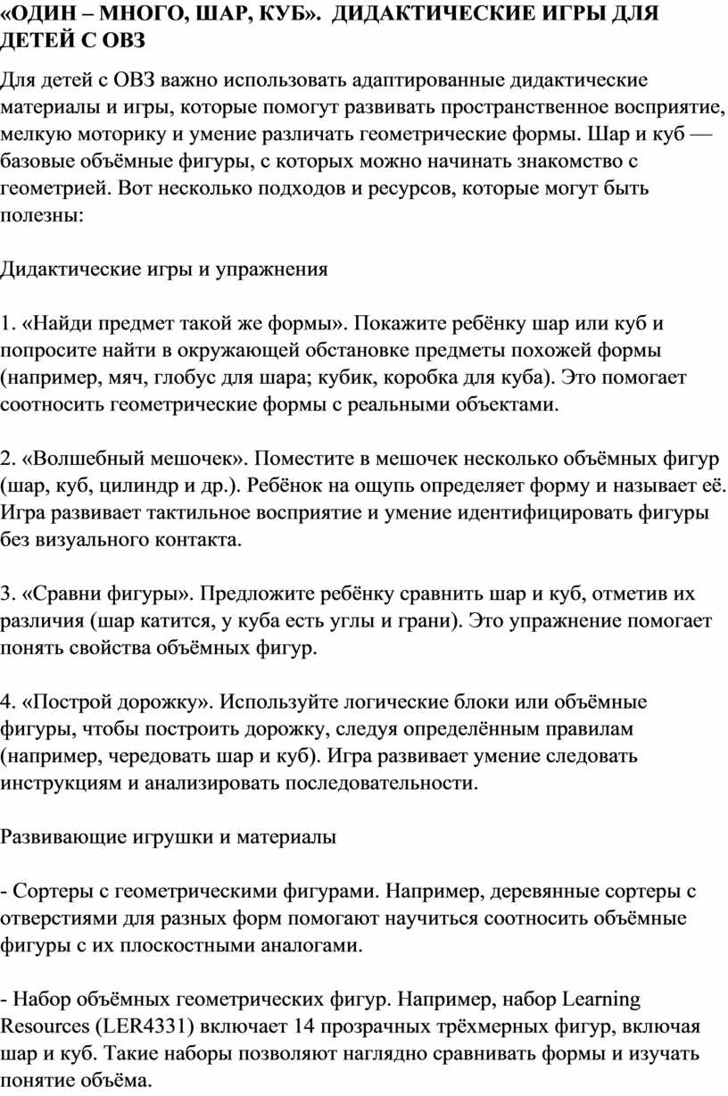«ОДИН – МНОГО, ШАР, КУБ». ДИДАКТИЧЕСКИЕ ИГРЫ ДЛЯ ДЕТЕЙ С ОВЗ