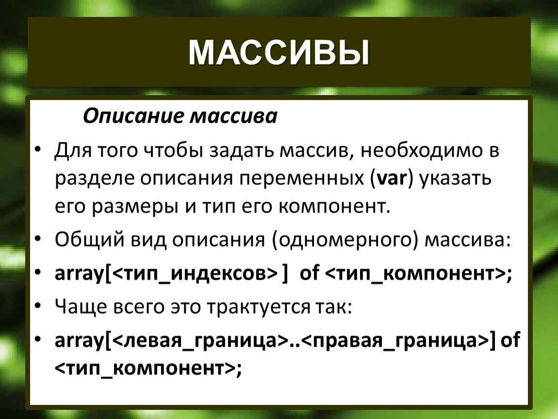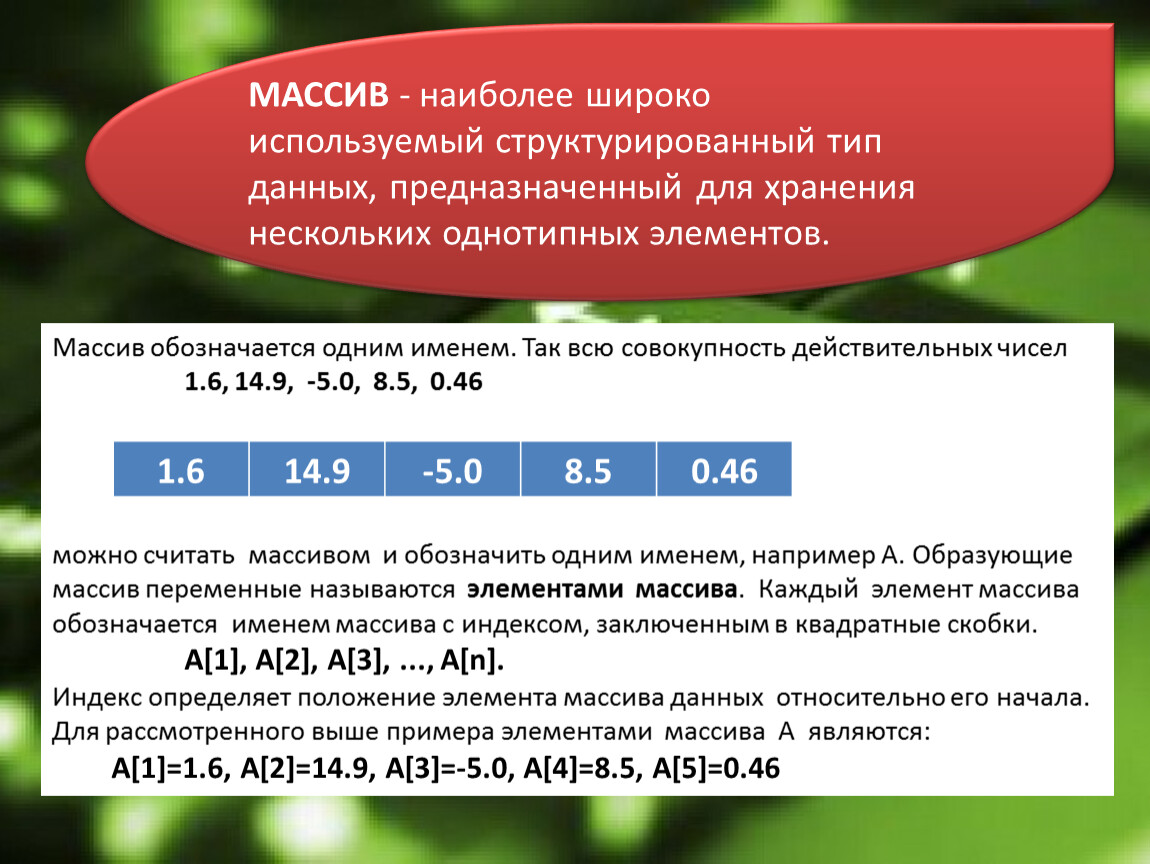 МАССИВ - наиболее широко используемый структурированный тип данных, предназначенный для хранения нескольких однотипных элементов.