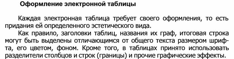 Каждая электронная таблица требует своего оформления, то есть придания ей определенного эстетического вида.