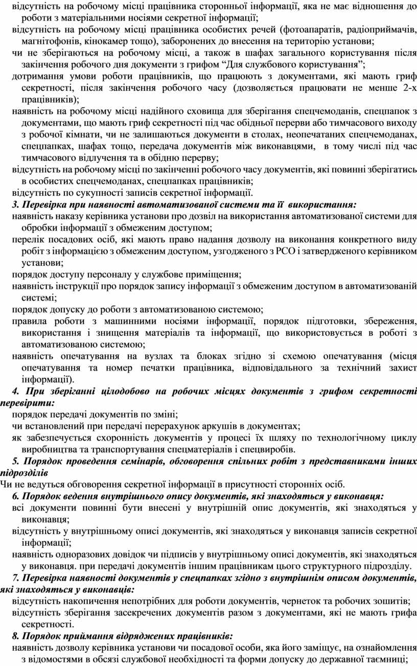 чи не зберігаються на робочому місці, а також в шафах загального користування після закінчення робочого дня документи з грифом “Для службового користування”;