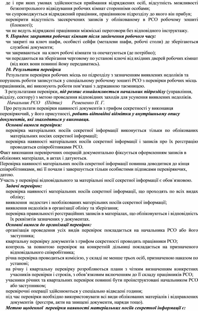 1.1.Перевірка дотримання режиму секретності на робочих місцях працівників, які виконують роботи, пов’язані з державною таємницею, здійснюється за двома формами: періодична або разова контрольна перевірка, та повсякденний контроль згідно з графіком, розробленим РСО з обов’язковою перевіркою всіх працівників.