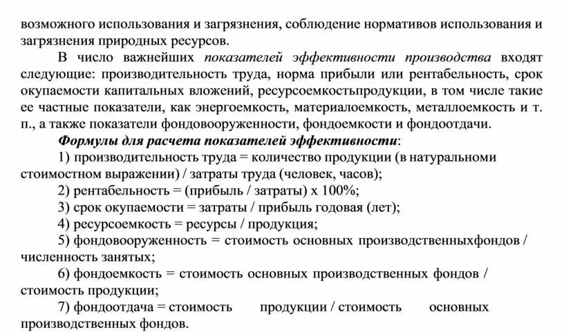 В число важнейших показателей эффективности производства входят следующие: производительность труда, норма прибыли или рентабельность, срок окупаемости капитальных вложений, ресурсоемкость продукции, в том числе такие ее частные показатели, как энергоемкость, материалоемкость, металлоемкость и т. п., а также показатели фондовооруженности, фондоемкости и фондоотдачи.