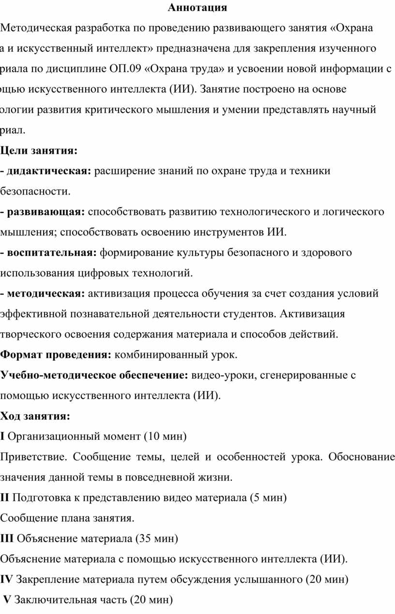 Методическая разработка по проведению развивающего занятия «Охрана труда и искусственный интеллект» предназначена для закрепления изученного материала по дисциплине ОП.09 «Охрана труда» и усвоении новой информации с помощью искусственного интеллекта (ИИ). Занятие построено на основе технологии развития критического мышления и умении представлять научный материал.