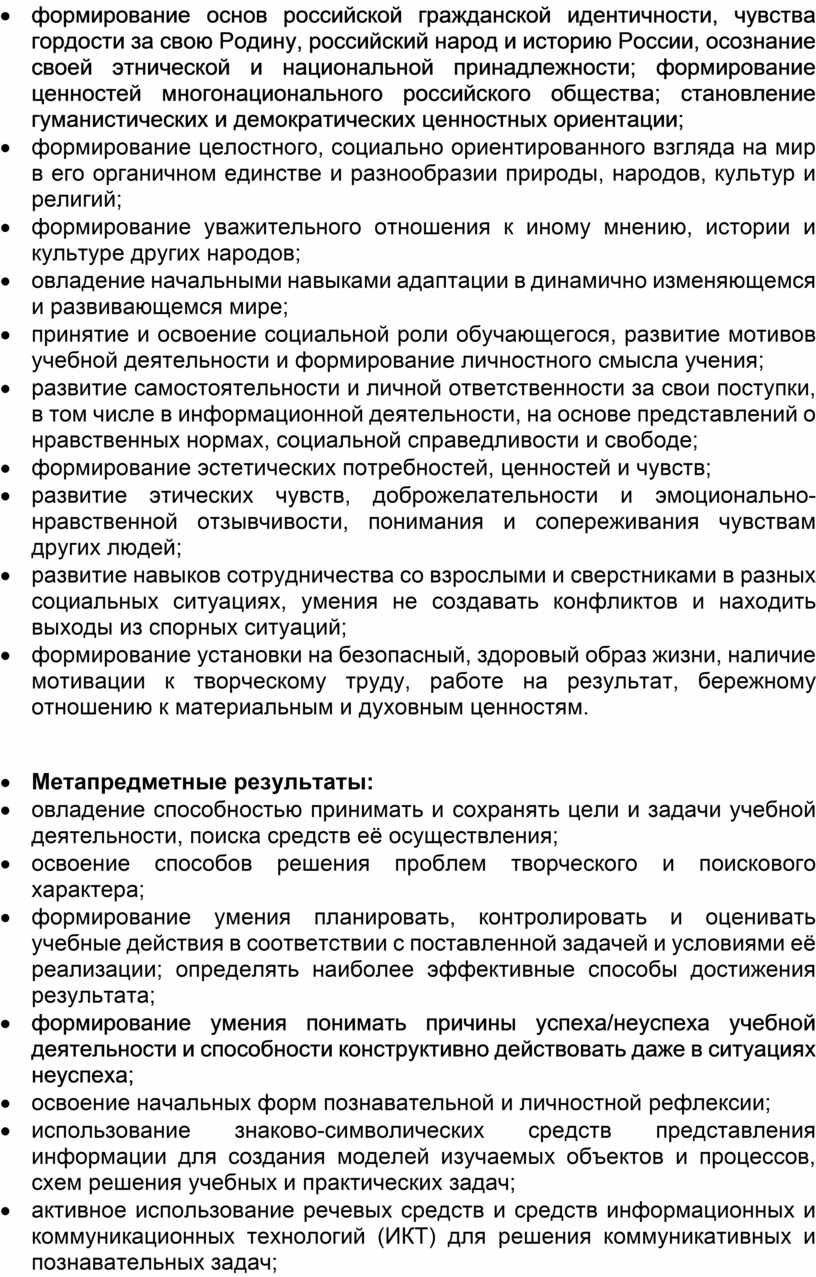 · формирование основ российской гражданской идентичности, чувства гордости за свою Родину, российский народ и историю России, осознание своей этнической и национальной принадлежности; формирование ценностей многонационального российского общества; становление гуманистических и демократических ценностных ориентации;