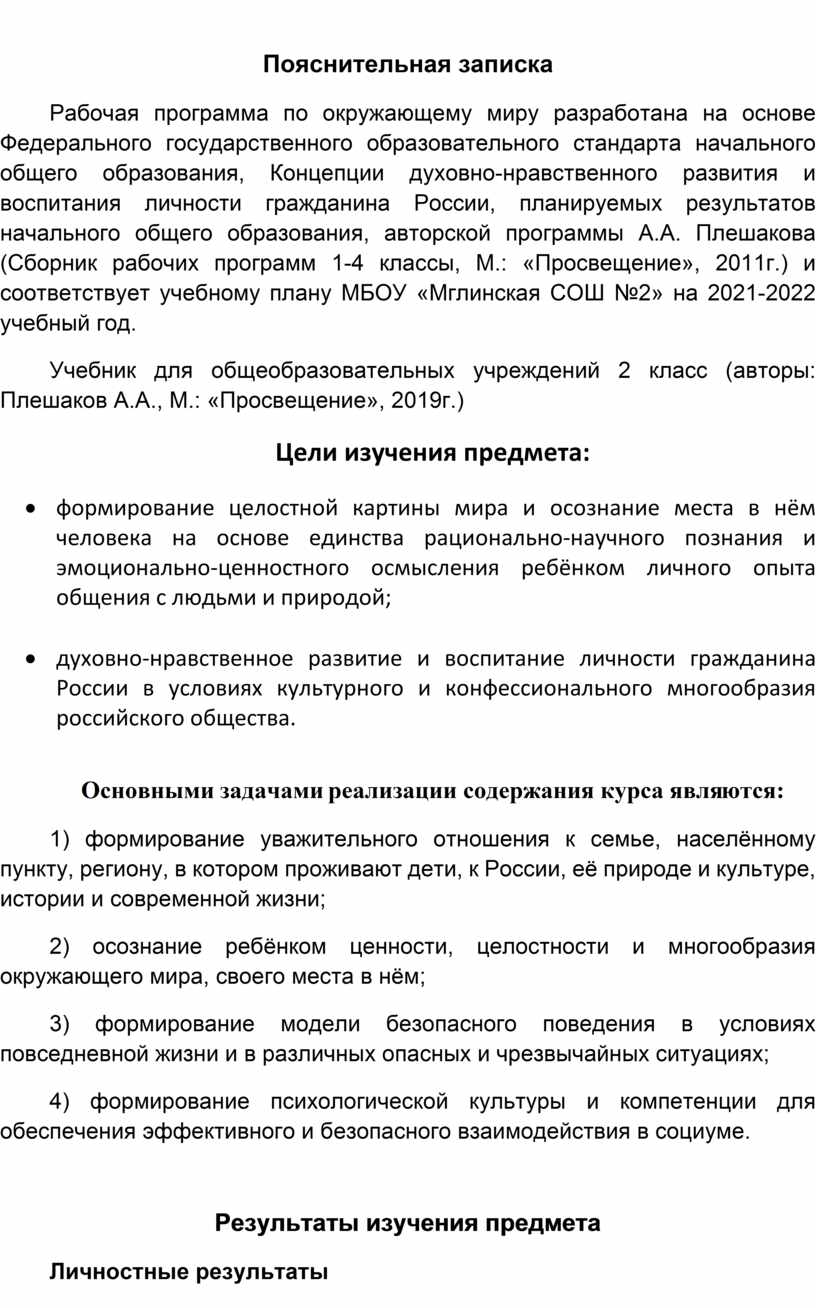 Рабочая программа по окружающему миру разработана на основе Федерального государственного образовательного стандарта начального общего образования, Концепции духовно-нравственного развития и воспитания личности гражданина России, планируемых результатов начального общего образования, авторской программы А.А. Плешакова (Сборник рабочих программ 1-4 классы, М.: «Просвещение», 2011г.) и соответствует учебному плану МБОУ «Мглинская СОШ №2» на 2021-2022 учебный год.