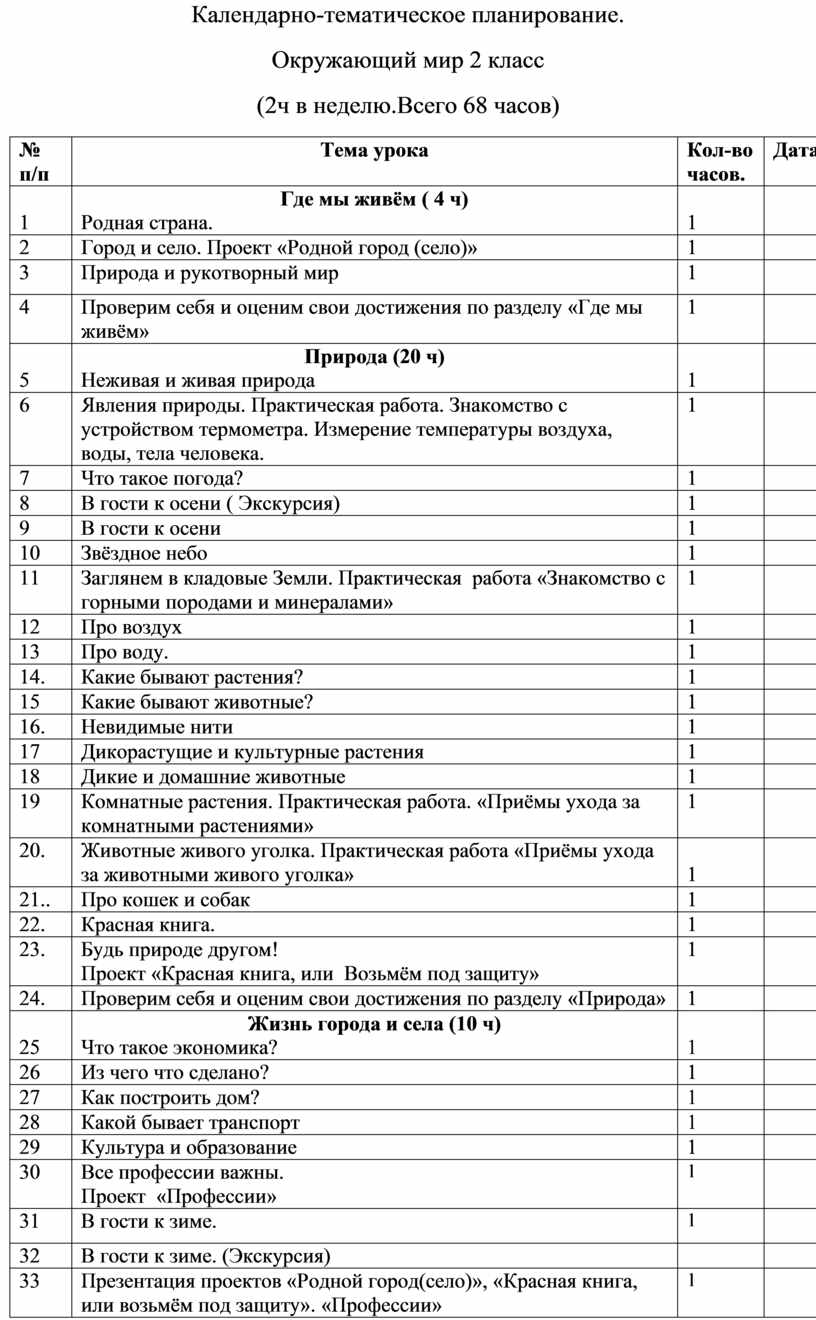 Природа Неживая и живая природа. Явления природы. Что такое погода. В гости к осени (экскурсия). В гости к осени (урок). Звездное небо. Заглянем в кладовые земли. Про воздух и про воду. Какие бывают растения. Какие бывают животные. Невидимые нити. Дикорастущие и культурные растения. Дикие и домашние животные. Комнатные растения. Животные живого уголка. Про кошек и собак. Красная книга. Будь природе другом. Проверим себя и оценим свои достижения по разделу «Природа»