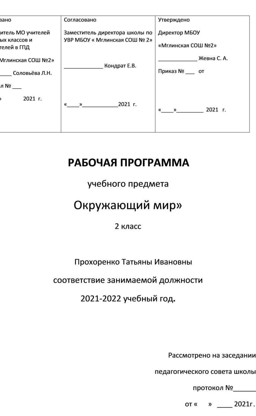 Согласовано Руководитель МО учителей начальных классов и воспитателей в ГПД МБОУ «Мглинская СОШ №2» __________ Соловьёва Л.Н. Протокол № ___ от « » 2021 г.