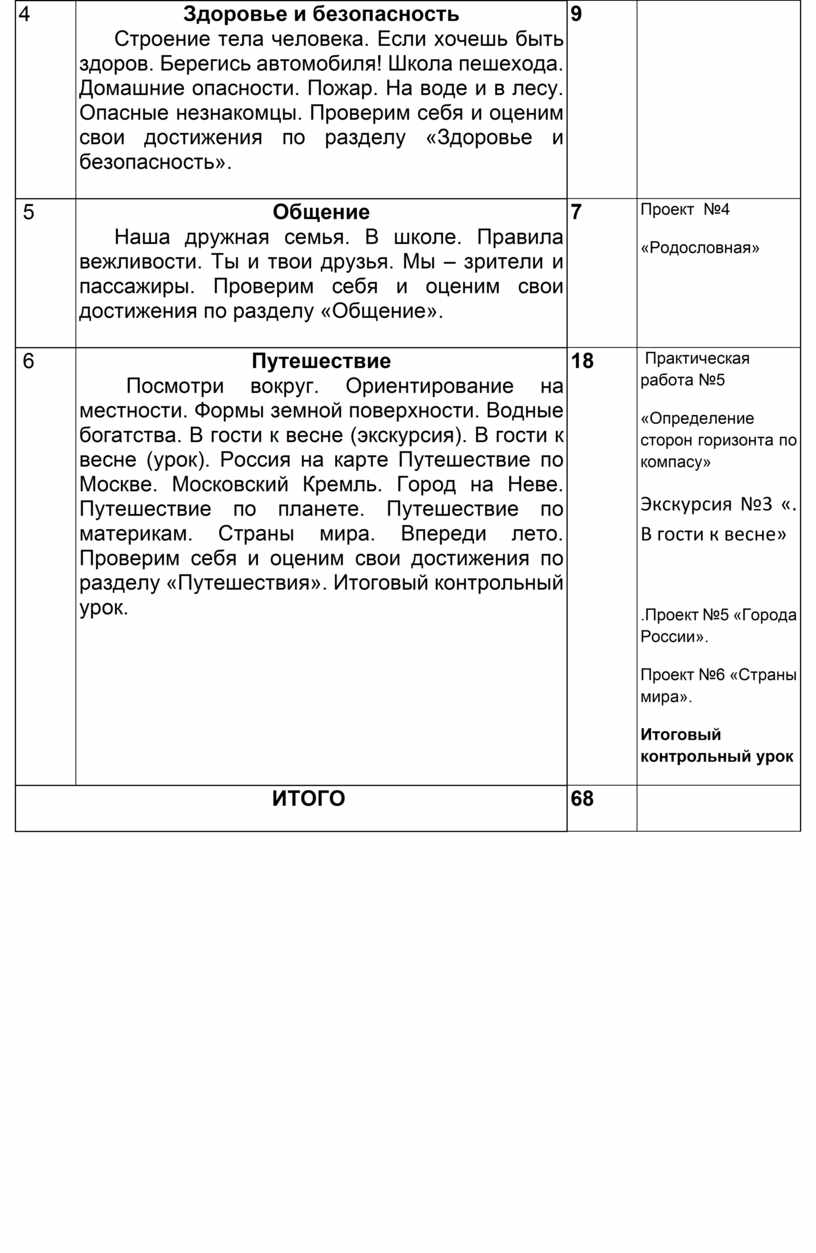 Путешествие Посмотри вокруг. Ориентирование на местности. Формы земной поверхности. Водные богатства. В гости к весне (экскурсия). В гости к весне (урок). Россия на карте Путешествие по Москве. Московский Кремль. Город на Неве. Путешествие по планете. Путешествие по материкам. Страны мира. Впереди лето. Проверим себя и оценим свои достижения по разделу «Путешествия». Итоговый контрольный урок.