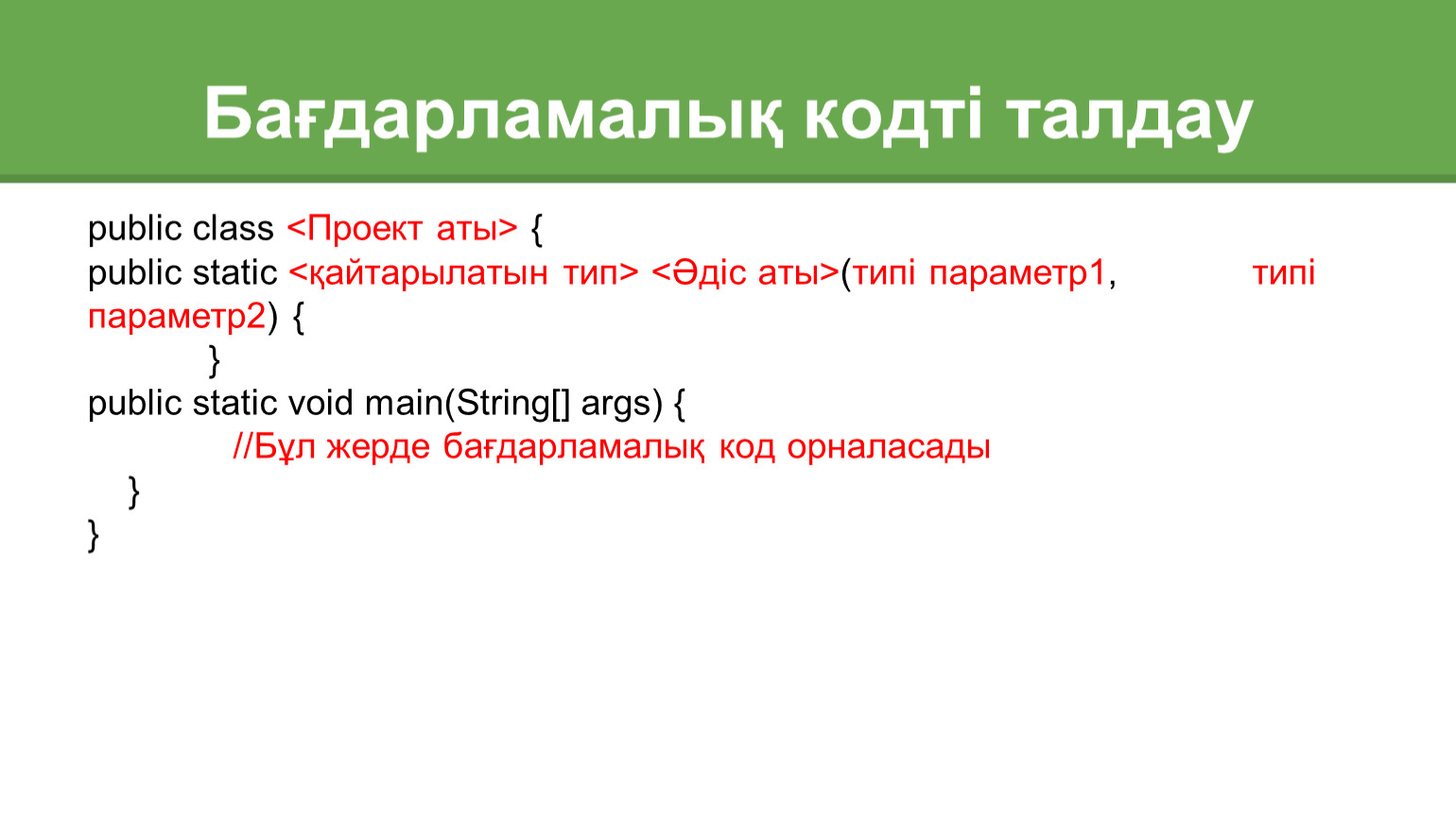 public static <қайтарылатын тип> <Әдіс аты>(типі параметр1, типі параметр2) {