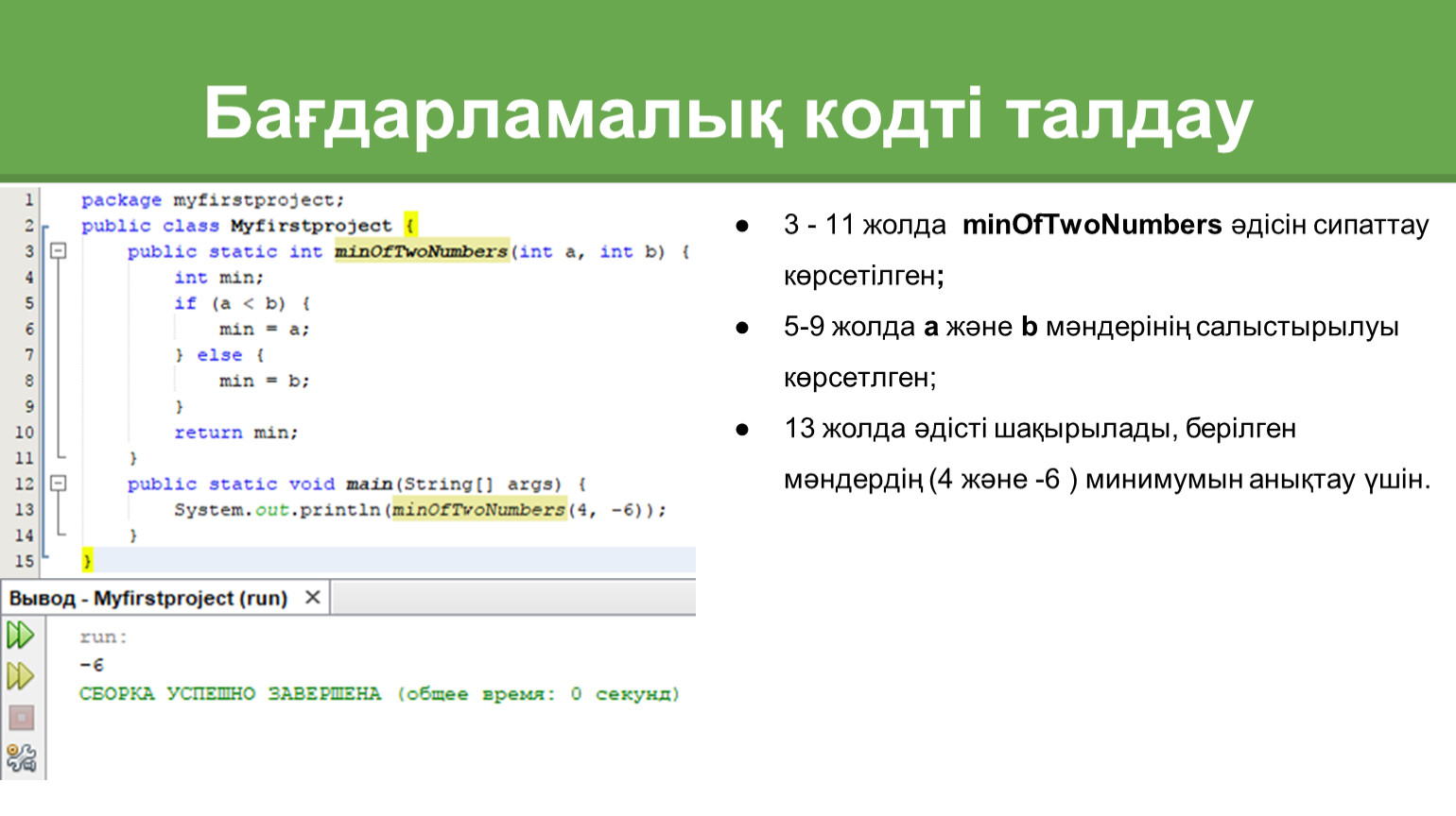 3 - 11 жолда minOfTwoNumbers әдісін сипаттау көрсетілген;