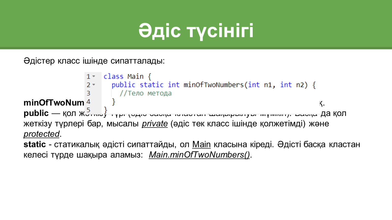 static - статикалық әдісті сипаттайды, ол Main класына кіреді. Әдісті басқа кластан келесі түрде шақыра аламыз: Main.minOfTwoNumbers().