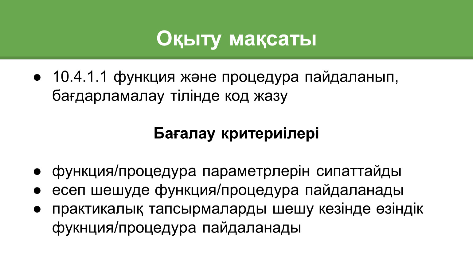 10.4.1.1 функция және процедура пайдаланып, бағдарламалау тілінде код жазу