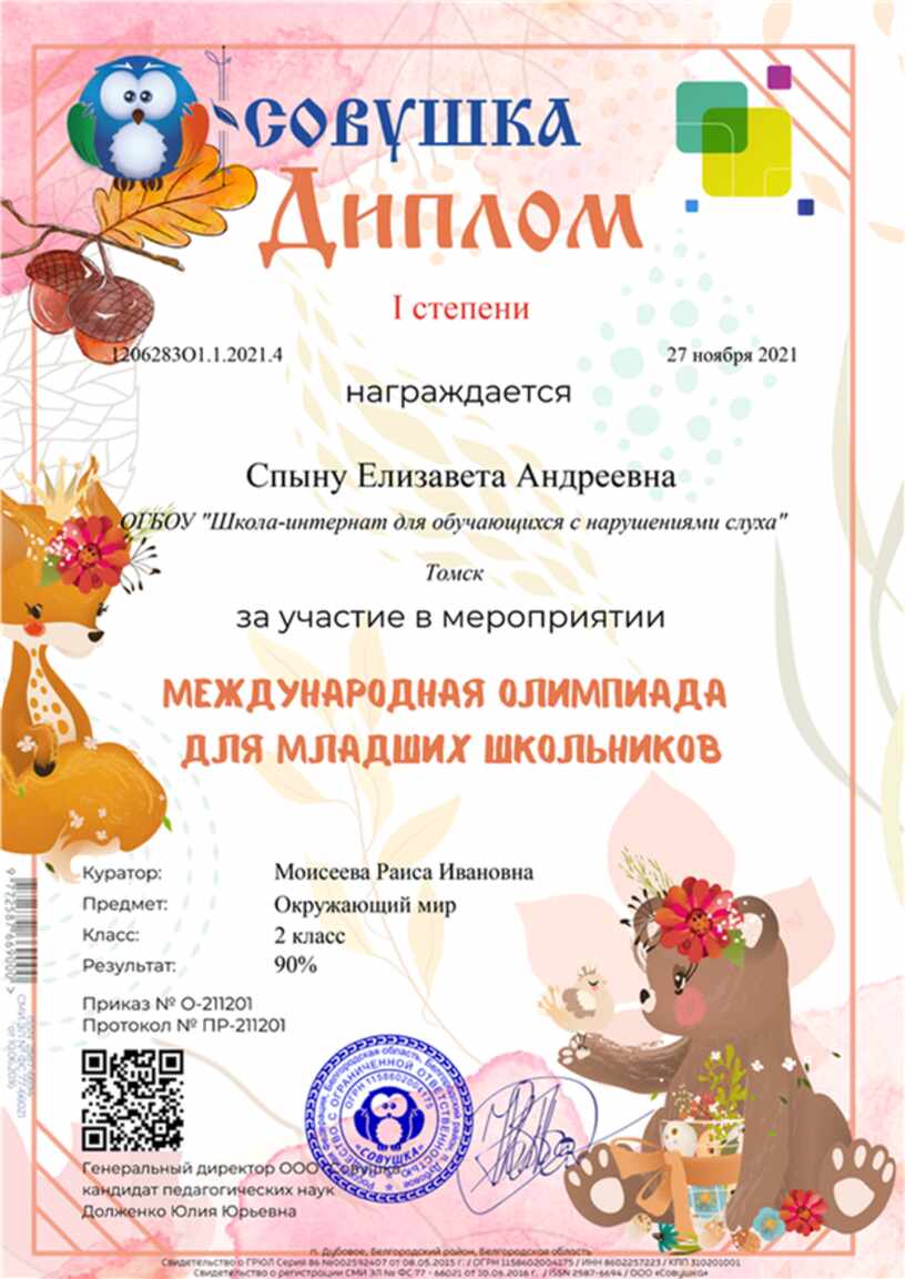 Олимпиада для младших школьников Диплом 1 степени Спыну Елизаветы