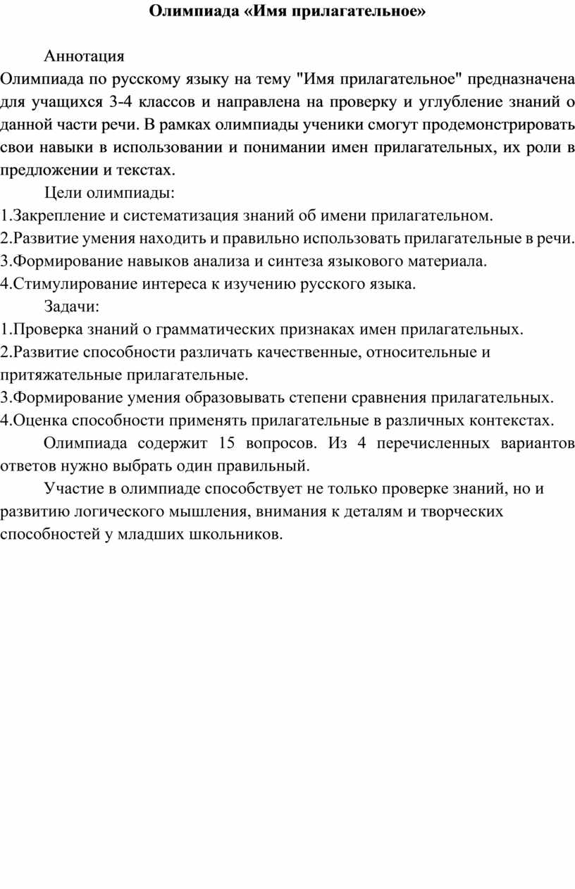Олимпиада по русскому языку на тему "Имя прилагательное" предназначена для учащихся 3-4 классов и направлена на проверку и углубление знаний о данной части речи. В рамках олимпиады ученики смогут продемонстрировать свои навыки в использовании и понимании имен прилагательных, их роли в предложении и текстах.