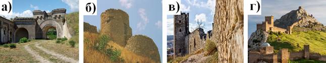 4. (2 балла) Соотнеси название генуэзских укреплённых торговых центров (крепостей) в Северном Причерноморье в XIII–XV веках и иллюстрации, им соответствующие. Ответ запиши в виде комбинации цифр и букв, без пробелов и каких-либо знаков препинания, цифры должны идти по порядку. Например: 1в2г3а4б