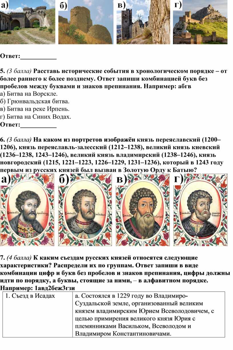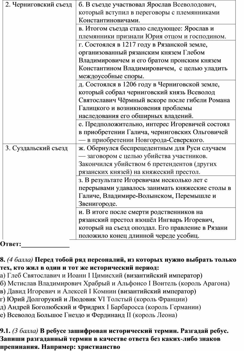 7. (4 балла) К каким съездам русских князей относятся следующие характеристики? Распредели их по группам. Ответ запиши в виде комбинации цифр и букв без пробелов и знаков препинания, цифры должны идти по порядку, а буквы, стоящие за ними, – в алфавитном порядке. Например: 1авд2беж3гзи
