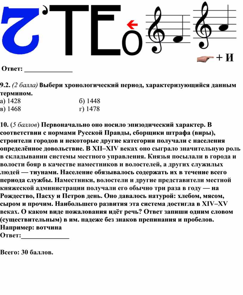 10. (5 баллов) Первоначально оно носило эпизодический характер. В соответствии с нормами Русской Правды, сборщики штрафа (виры), строители городов и некоторые другие категории получали с населения определённое довольствие. В XII–XIV веках оно сыграло значительную роль в складывании системы местного управления. Князья посылали в города и волости бояр в качестве наместников и волостелей, а других служилых людей — тиунами. Население обязывалось содержать их в течение всего периода службы. Наместники, волостели и другие представители местной княжеской администрации получали его обычно три раза в году — на Рождество, Пасху и Петров день. Оно давалось натурой: хлебом, мясом, сыром и прочим. Наибольшего развития эта система достигла в XIV–XV веках. О каком виде пожалования идёт речь? Ответ запиши одним словом (существительным) в им. падеже без знаков препинания и пробелов. Например: вотчина
