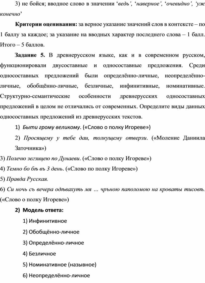 Задание 5 (6 баллов). В древнерусском языке, как и в современном русском, функционировали двусоставные и односоставные предложения. Среди односоставных предложений были определённо-личные, неопределённо- личные, обобщённо-личные, безличные, инфинитивные, номинативные. Структурно-семантические особенности древнерусских односоставных предложений в целом не отличались от современных. Определите виды данных односоставных предложений из древнерусских текстов.