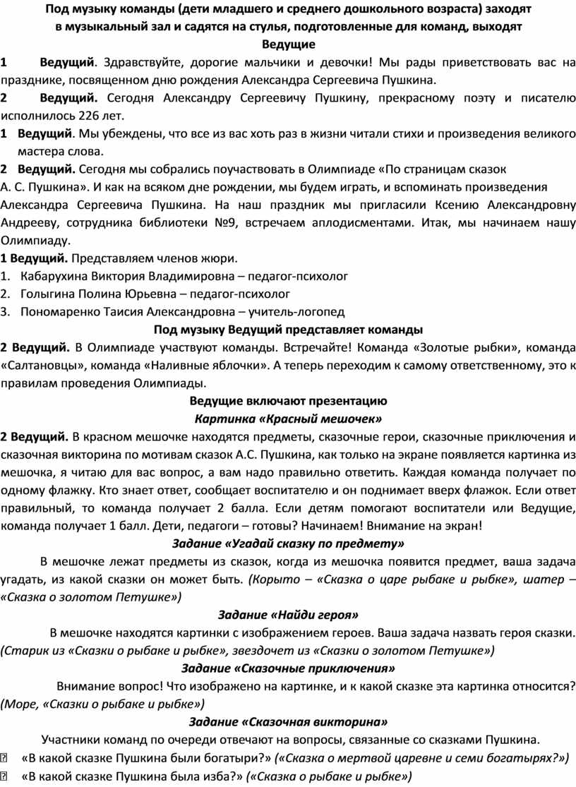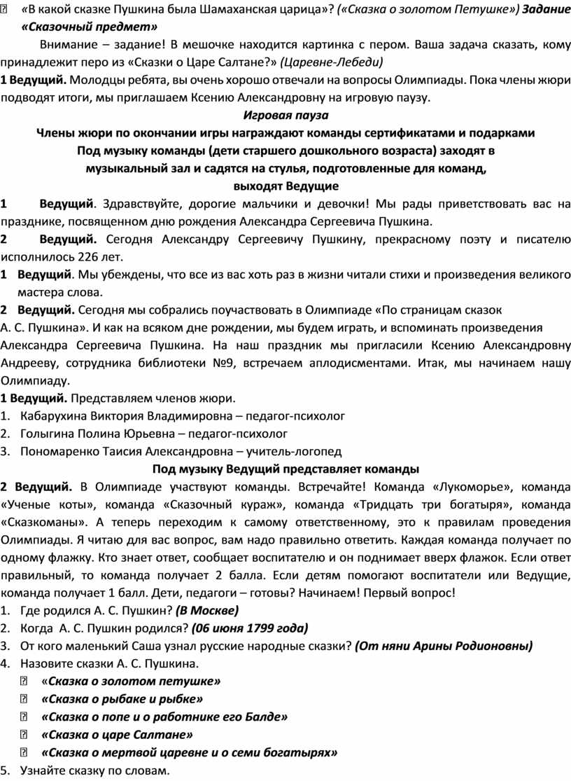 ОЛИМПИАДА «ПО СТРАНИЦАМ СКАЗОК А.С. ПУШКИНА»