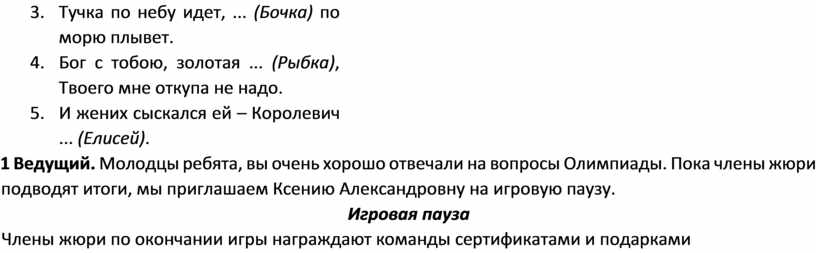 1 Ведущий. Молодцы ребята, вы очень хорошо отвечали на вопросы Олимпиады. Пока члены жюри подводят итоги, мы приглашаем Ксению Александровну на игровую паузу.