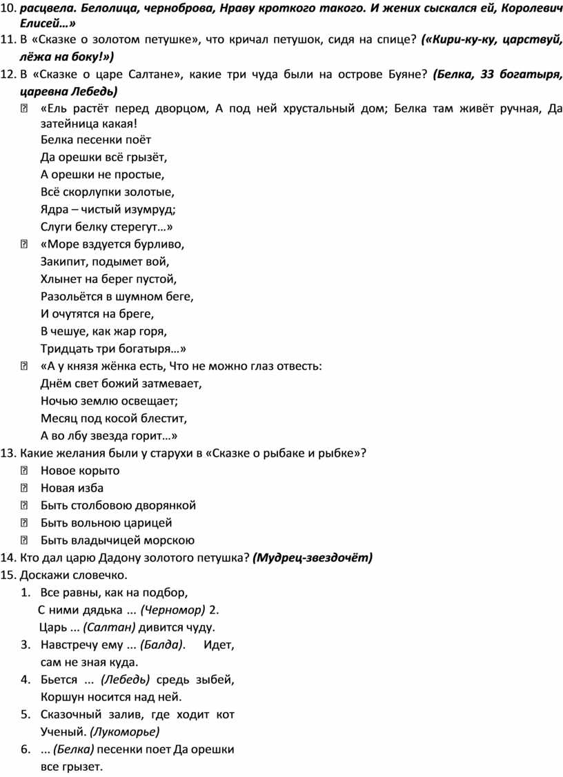 1) Окошко, бочка царь, сестры, остров, лебедь, белка, богатыри, свадьба, расплата. («Сказка о царе Салтане, о сыне его славном и могучем богатыре князе Гвидоне Салтановиче и о прекрасной царевне Лебеди»)