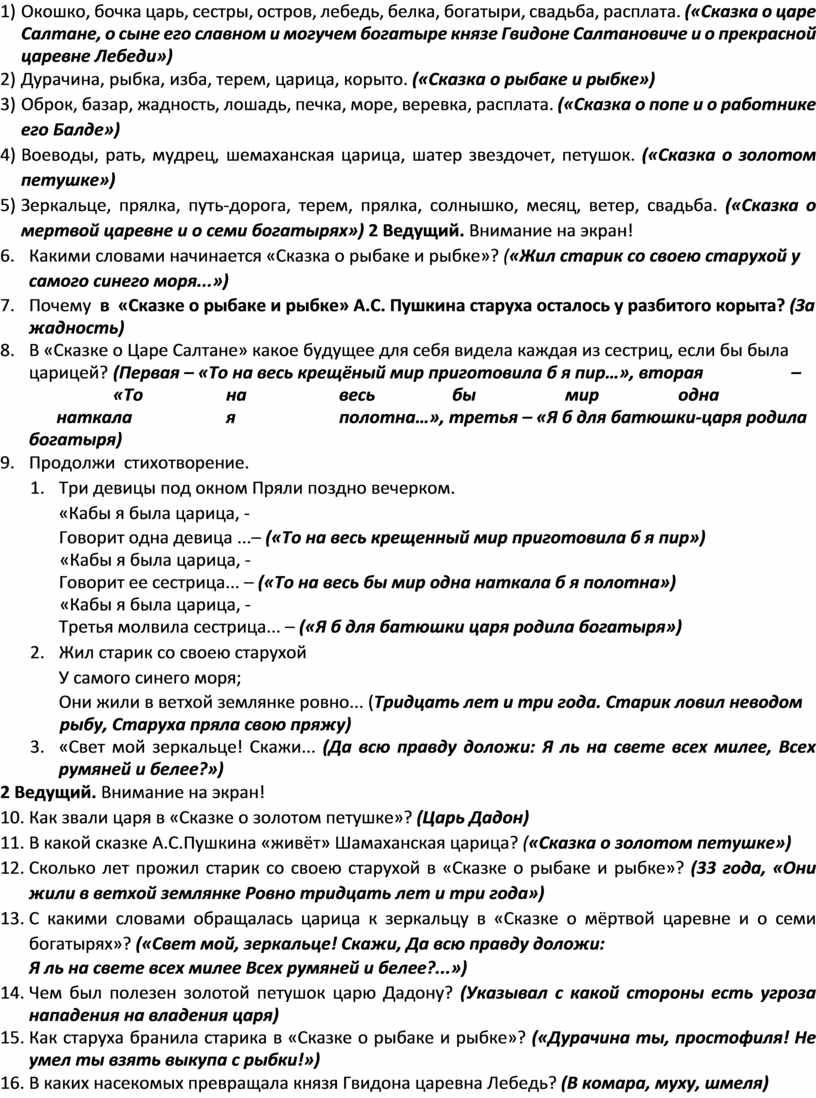 Участники команд по очереди отвечают на вопросы, связанные со сказками Пушкина.