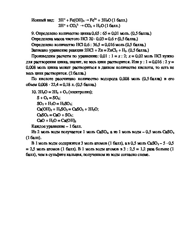 9. Определено количество цинка 0,65 : 65 = 0,01 моль. (0,5 балла.)