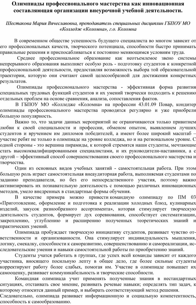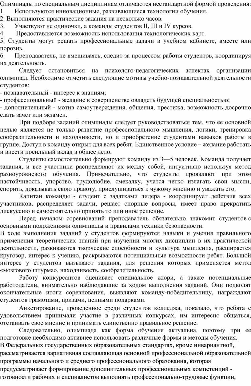 Олимпиада профессионального мастерства, являясь инновационной составляющей организации внеурочной учебной деятельности, основана на активном и деятельном подходе к организации учебного и воспитательного процесса, развивает творческие способности студентов, раскрывает их потенциальные возможности.