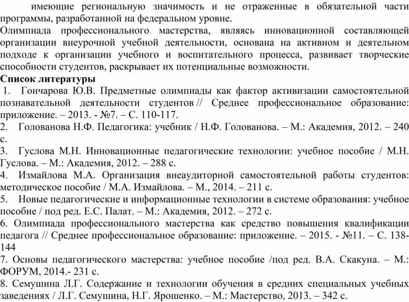 1. Гончарова Ю.В. Предметные олимпиады как фактор активизации самостоятельной познавательной деятельности студентов // Среднее профессиональное образование: приложение. – 2013. - №7. – С. 110-117.