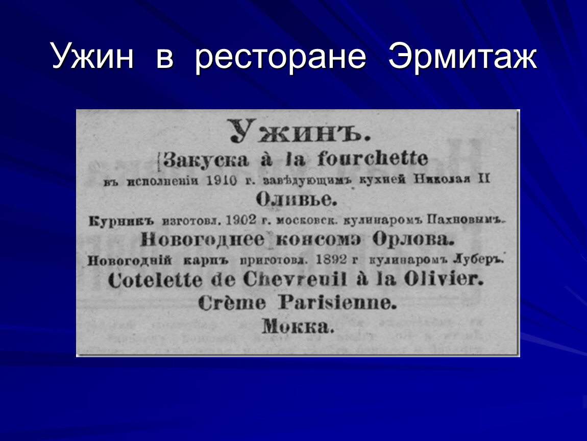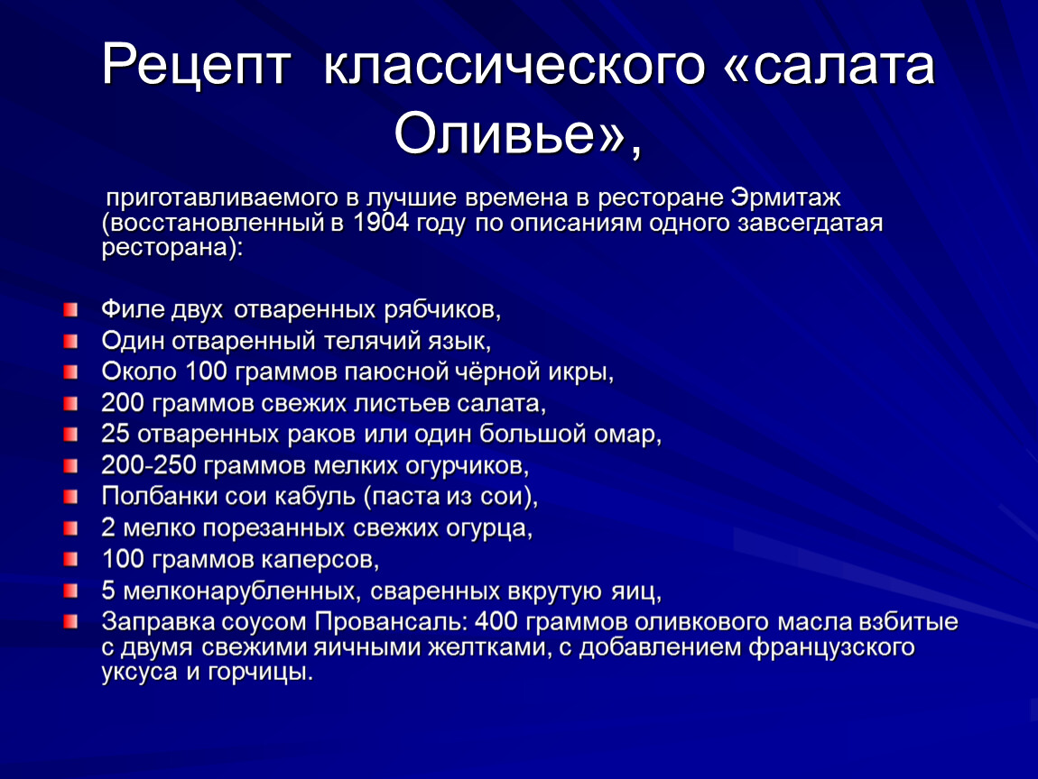 приготавливаемого в лучшие времена в ресторане Эрмитаж (восстановленный в 1904 году по описаниям одного завсегдатая ресторана):