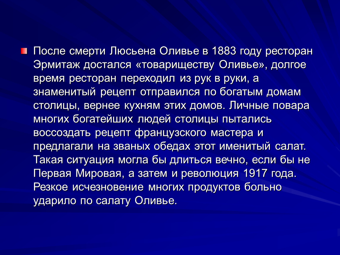 После смерти Люсьена Оливье в 1883 году ресторан Эрмитаж достался «товариществу Оливье», долгое время ресторан переходил из рук в руки, а знаменитый рецепт отправился по богатым домам столицы, вернее кухням этих домов. Личные повара многих богатейших людей столицы пытались воссоздать рецепт французского мастера и предлагали на званых обедах этот именитый салат. Такая ситуация могла бы длиться вечно, если бы не Первая Мировая, а затем и революция 1917 года. Резкое исчезновение многих продуктов больно ударило по салату Оливье.