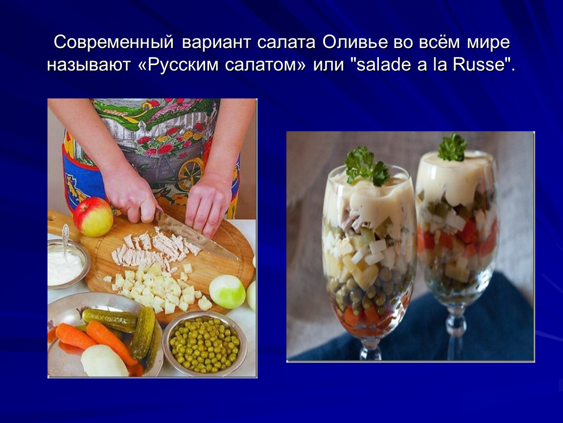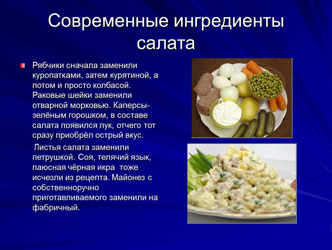 Листья салата заменили петрушкой. Соя, телячий язык, паюсная чёрная икра тоже исчезли из рецепта. Майонез с собственноручно приготавливаемого заменили на фабричный.