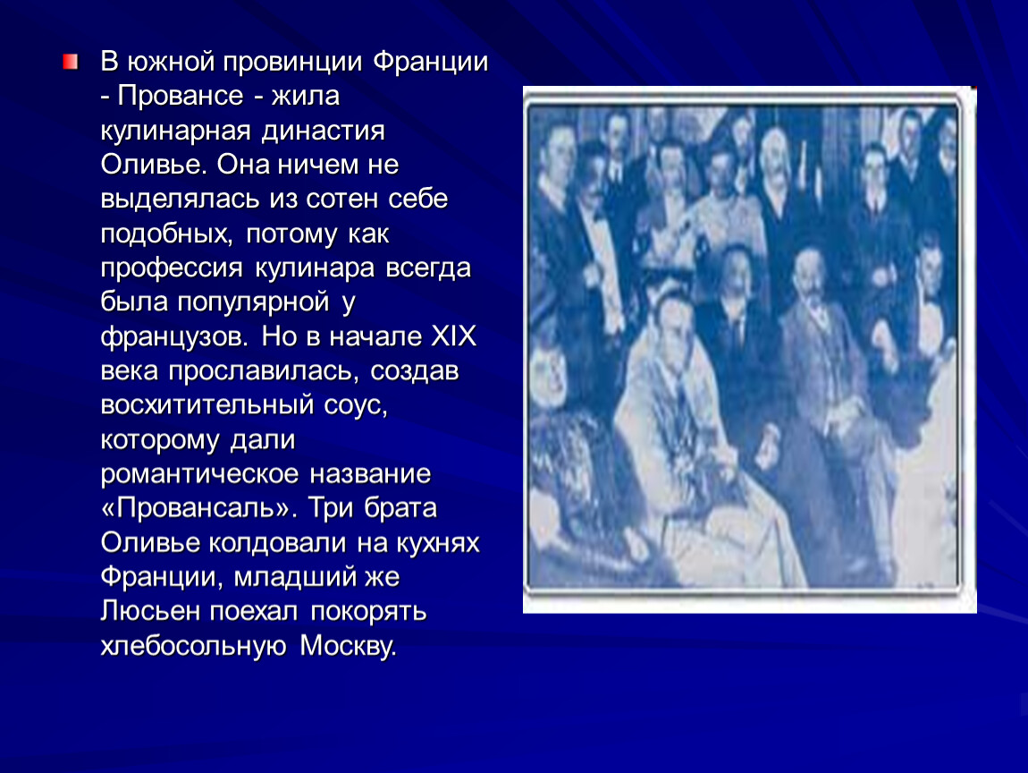 В южной провинции Франции - Провансе - жила кулинарная династия Оливье. Она ничем не выделялась из сотен себе подобных, потому как профессия кулинара всегда была популярной у французов. Но в начале XIХ века прославилась, создав восхитительный соус, которому дали романтическое название «Провансаль». Три брата Оливье колдовали на кухнях Франции, младший же Люсьен поехал покорять хлебосольную Москву.