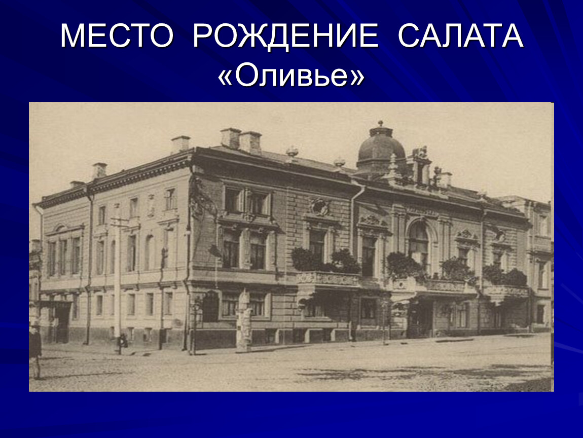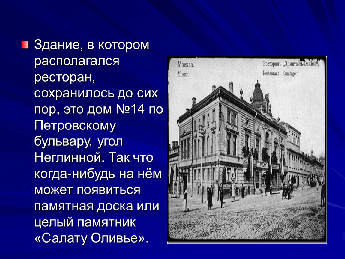Здание, в котором располагался ресторан, сохранилось до сих пор, это дом №14 по Петровскому бульвару, угол Неглинной. Так что когда-нибудь на нём может появиться памятная доска или целый памятник «Салату Оливье».