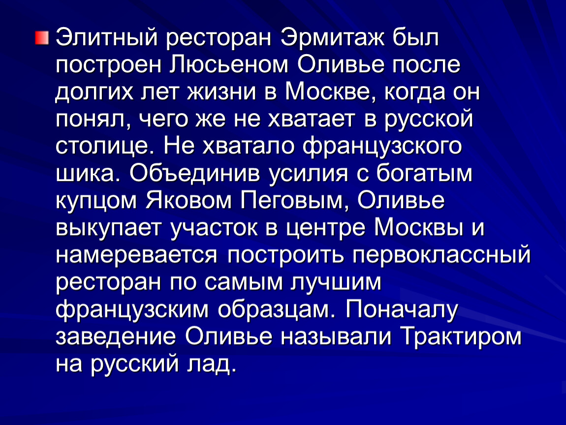 Элитный ресторан Эрмитаж был построен Люсьеном Оливье после долгих лет жизни в Москве, когда он понял, чего же не хватает в русской столице. Не хватало французского шика. Объединив усилия с богатым купцом Яковом Пеговым, Оливье выкупает участок в центре Москвы и намеревается построить первоклассный ресторан по самым лучшим французским образцам. Поначалу заведение Оливье называли Трактиром на русский лад.