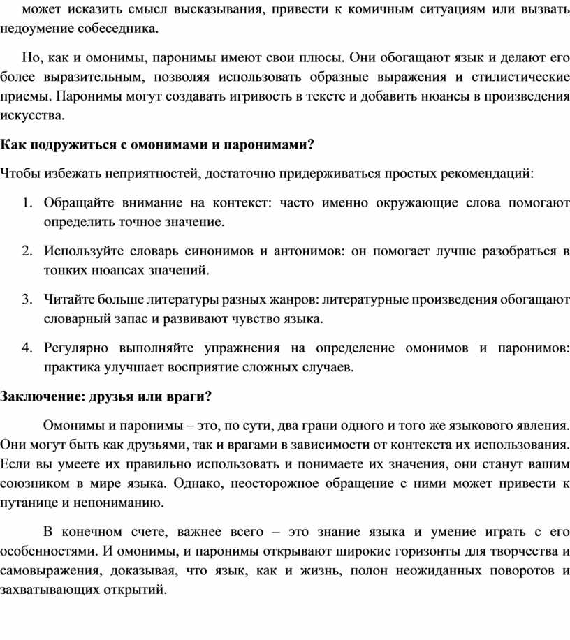 Омонимы и паронимы – это, по сути, два грани одного и того же языкового явления. Они могут быть как друзьями, так и врагами в зависимости от контекста их использования. Если вы умеете их правильно использовать и понимаете их значения, они станут вашим союзником в мире языка. Однако, неосторожное обращение с ними может привести к путанице и непониманию.