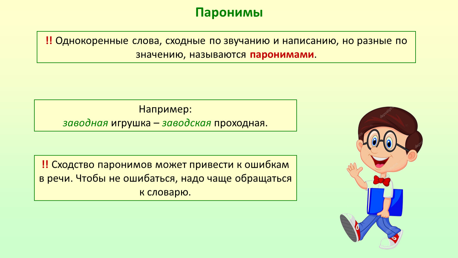 !! Сходство паронимов может привести к ошибкам в речи. Чтобы не ошибаться, надо чаще обращаться к словарю.