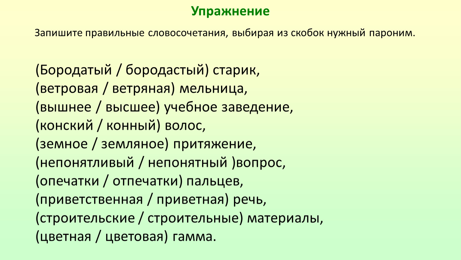 Запишите правильные словосочетания, выбирая из скобок нужный пароним.