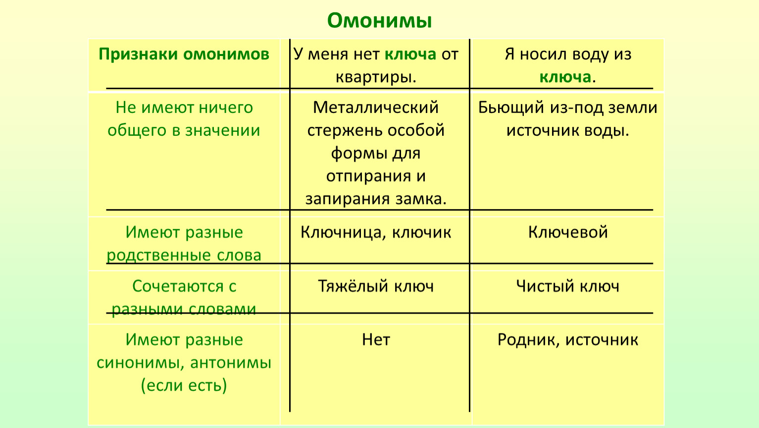 Признаки омонимов | У меня нет ключа от квартиры. | Я носил воду из ключа. |