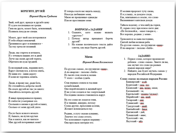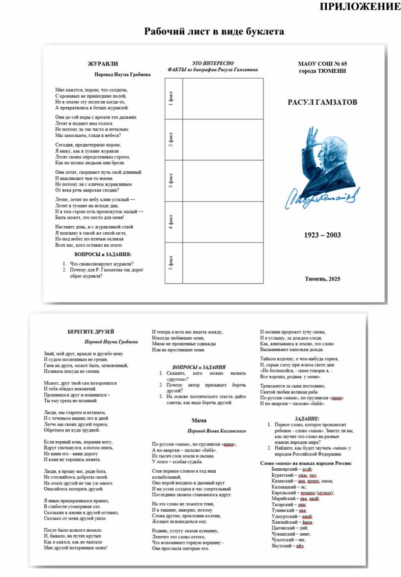 Рабочие листы нам пригодятся в течение всего урока, будем обращаться к поэзии Расула Гамзатова и к вопросам по данным стихотворениям, задания которые расположены в буклете.