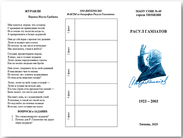 Задание: На столах находятся рабочие листы в виде буклета. В ходе нашей встречи – не только внимательно слушаете, но и работаете с буклетом – с таблицей «Это интересно». Факты из биографии Расула Гамзатова.