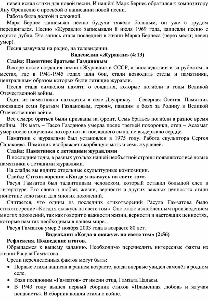 Сегодня мы поговорим только об одной песне, возможно самой известной – это песня «Журавли». Стихи Расул Гамзатов написал на родном языке, и тема журавлей была навеяна посещением в Японии памятника японской девочке по имени Садако Сасаки, страдавшей от лейкемии после атомного взрыва в Хиросиме.