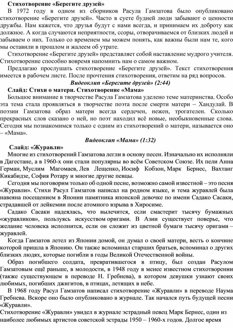 Слайд: Творчество Расула Гамзатова. Стихотворение «Берегите друзей»